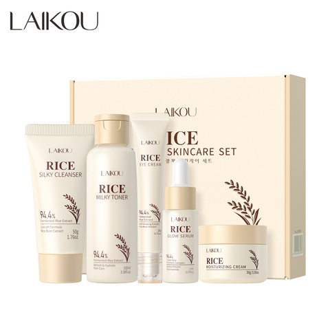 LAIKOU 5PCS Ensemble de soins de la peau au riz Marque privée Sérum éclatant Nettoyant en soie Fabricant de crème tonique pour les yeux pour femmes