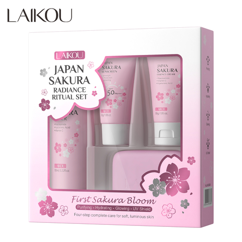 LAIKOU 4PCS Japon Sakura Kit de Voyage Cosmétiques Ensemble de Soins de la Peau en Gros Collection de Soins de la Peau Nettoyant Toner Crème Visage Crème Solaire