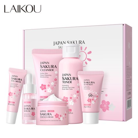 LAIKOU Japan Sakura Set de soins de la peau 6PCS avec crème solaire SPF50 PA +++ Ecran solaire à usage diurne Soin de nuit Sérum crème pour le visage